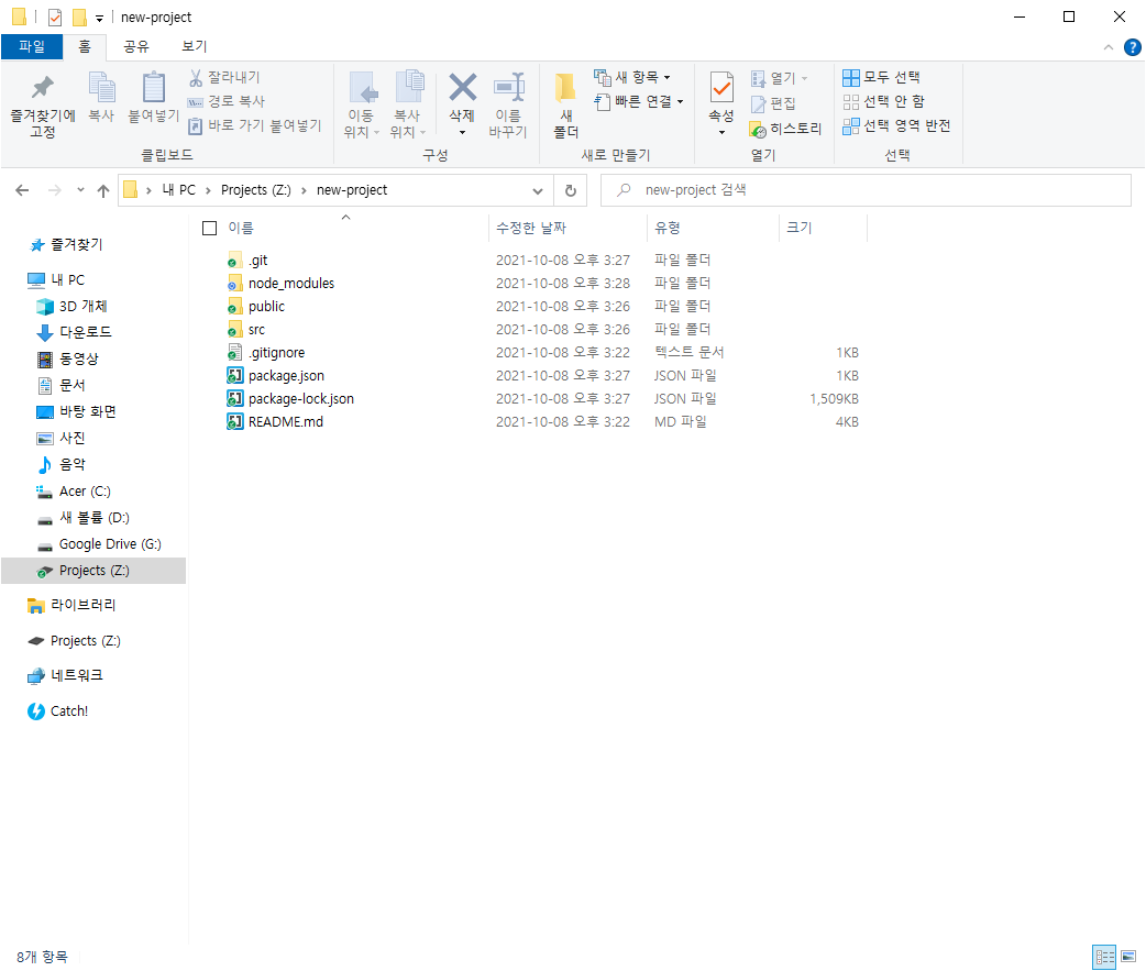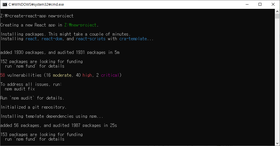 아래처럼 Z:\new-project 라는 폴더가 만들어지고 React 프로젝트를 시작하기 위한 구성요소들이