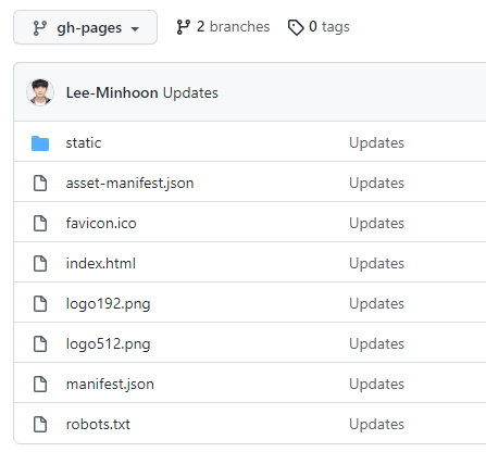 생성했던 저장소에 gh-pages라는 브랜치가 생성되고, 웹 파일들이 push 되어있는 것을 확인할 수 있습니다.