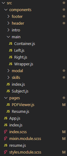 이력서에 들어갈 데이터도 분리가 안 돼 있거니와, 각 컴포넌트(Header, Skill, Content, Footer)들도