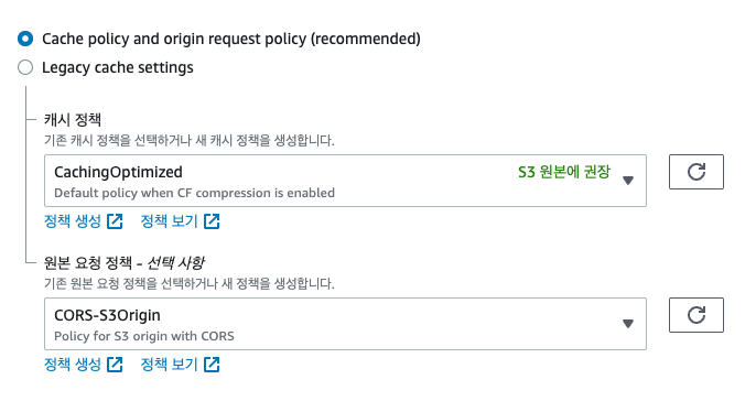 가장 중요한 것은 원본 요청 정책을 CORS-S3Origin 으로 설정하는 것인데,