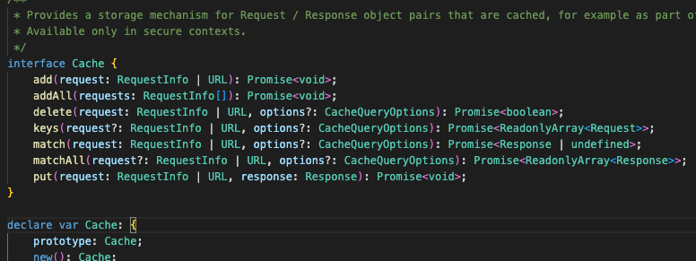 Cache 인터페이스는 ServiceWorker 의 생명주기의 일부로 캐시 된 Request와 Response를 나타냅니다.
