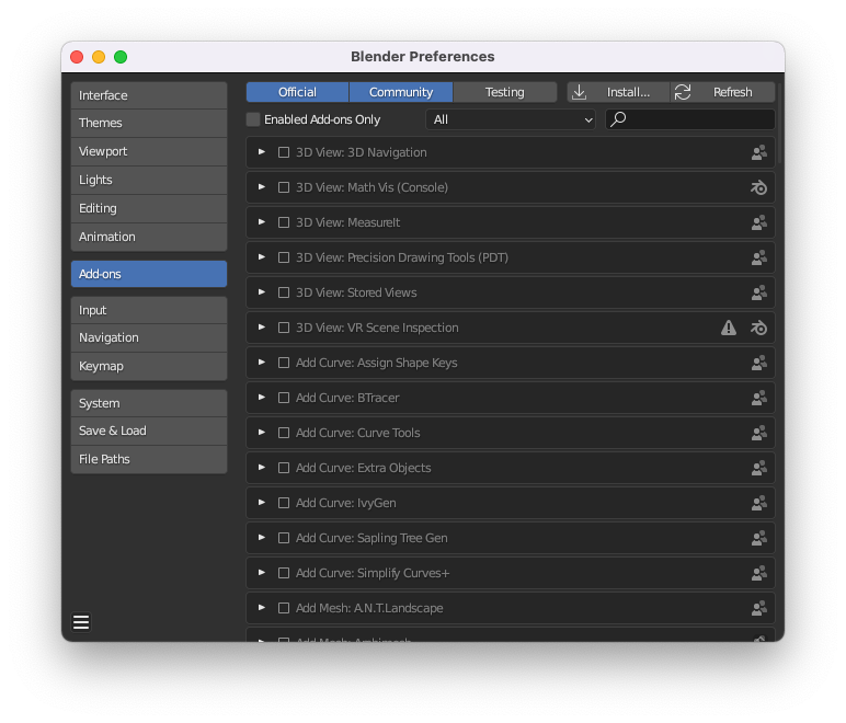 그런 다음 Blender에서 Edit -> Preference -> Add-ons에 들어간다.