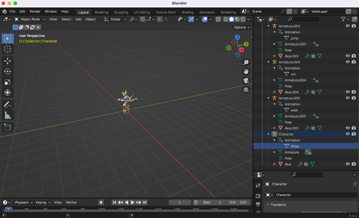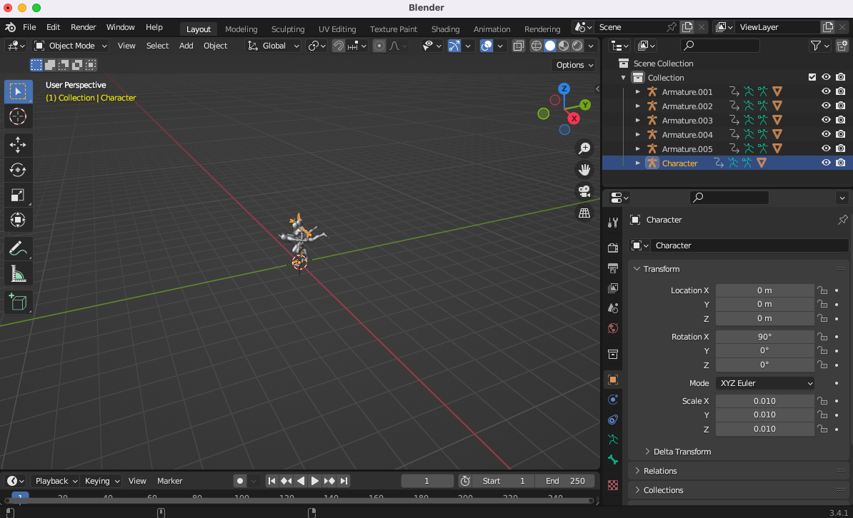 그러고 나서 Armature(애니메이션이 아닌 모델 본체)의 이름을 Character로 바꾼다.
