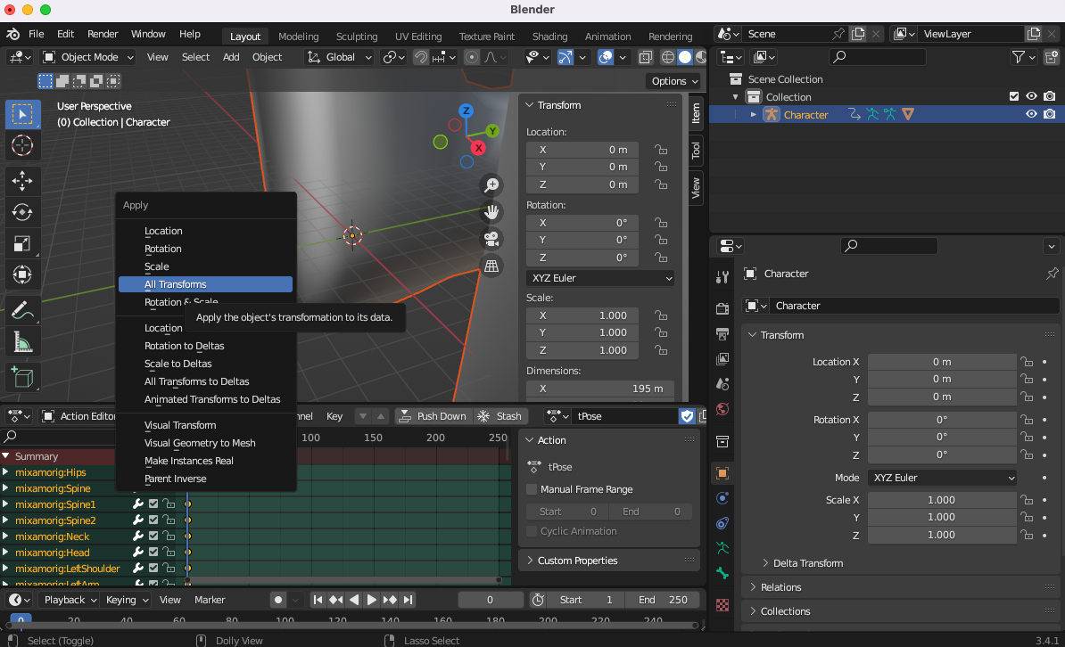 수정했다면 Ctrl+A 버튼을 눌러 All Transforms로 변경 사항을 적용해주자.