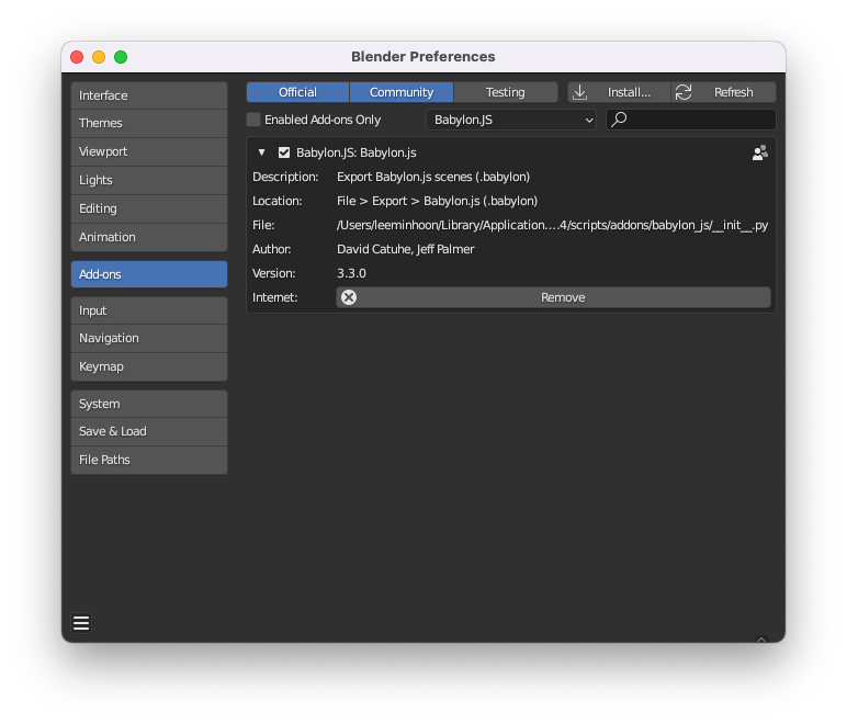BabylonJS 팀에서 개발한 BlenderExporter를 다운받는다.