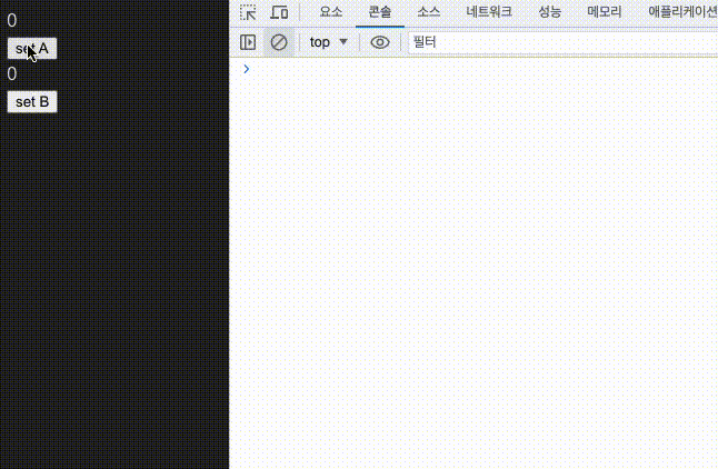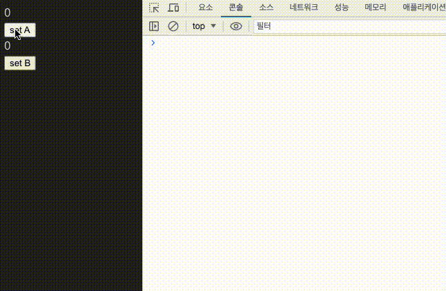 그래서 setA가 실행된 시점에 store의 state인 { a, setA, b, setB } 는 새로운 오브젝트로 바뀌게 되고,