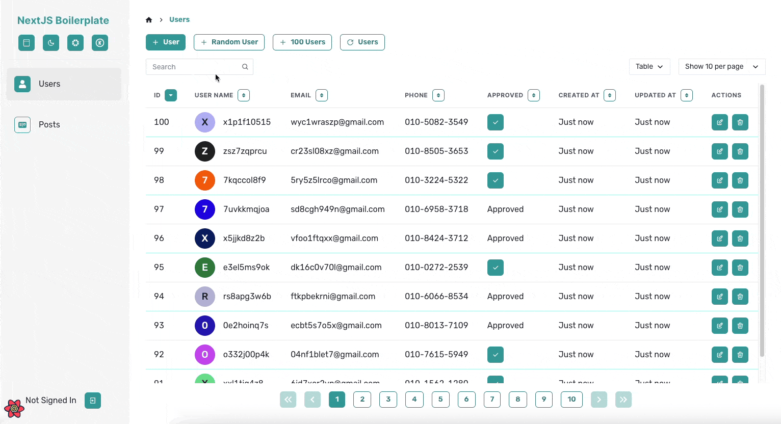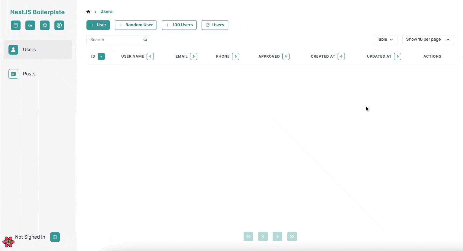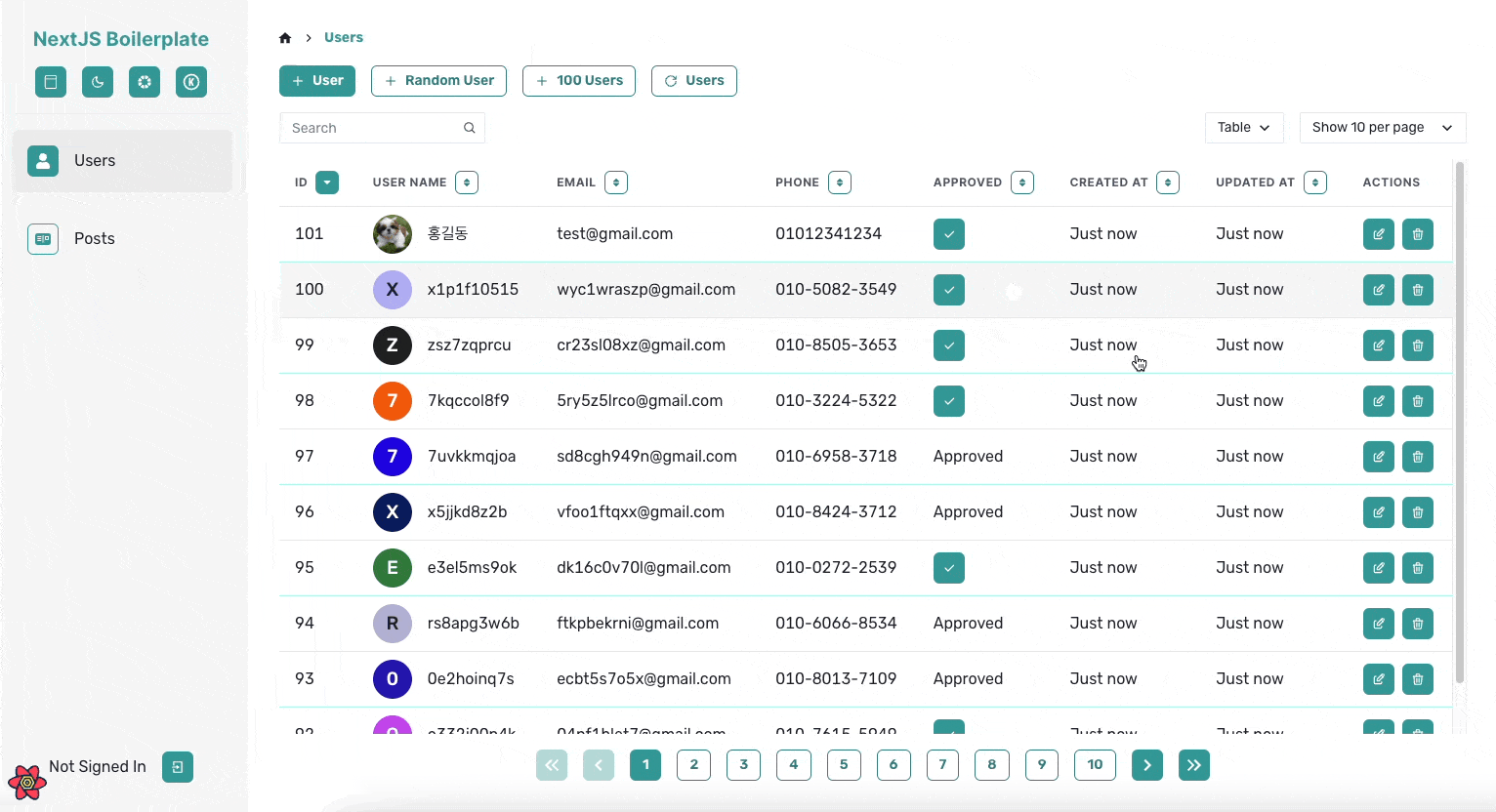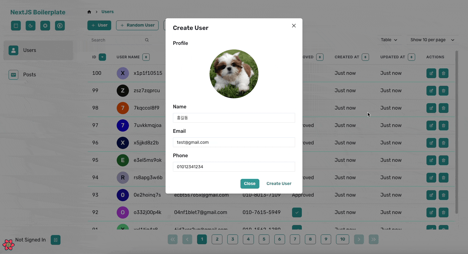 그래서 앞서 말한 공통적인 기능들이 최대한 많이 포함되도록 프로젝트 개발을 진행하였습니다. 이름은 NextJS Boilerplate지만 코드의 대부분은 CSR로 동작하게 되는데요. 저는 내부 툴이나 백오피스 같은 프로젝트를 Next.js가 아닌 React만으로 진행할 때도 많기 때문에, React Query를 적극 활용한 CSR 위주의 코드를 작성했습니다.